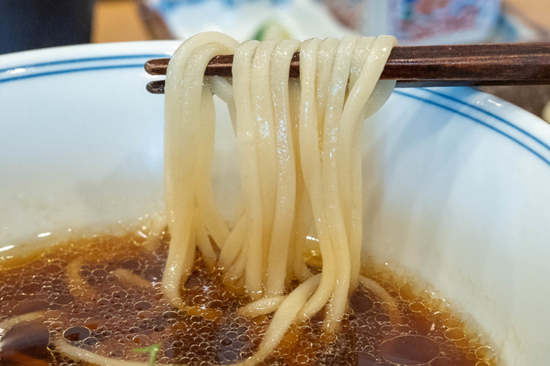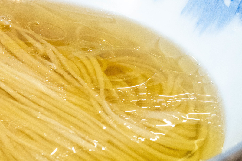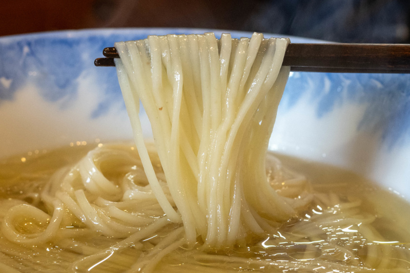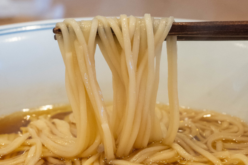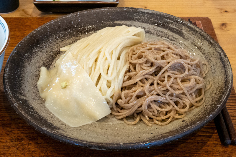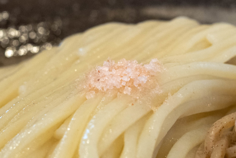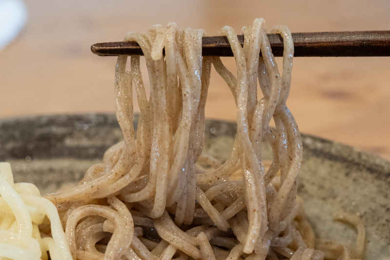 国産小麦ならではのきめ細かいシルキーな麺肌の白い麺(小麦粒の中心部)、石臼で独自に粒度調整した風味豊かな黒い麺(小麦粉の外側からその付近)。