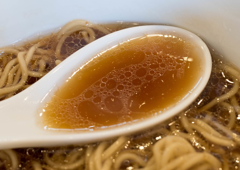 褐色を帯びた清湯スープは、鶏がメインで貝が下支えになり、雑味がなくスッキリとした味わい。 |