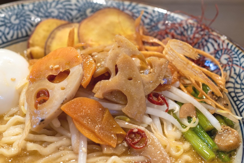 表面の油がほぼ皆無でスッキリとしているものの、旨味がたっぷりの芳醇な味噌スープ。 根菜類がたっぷりで、 ゴボウチップの香ばしさ、 パリパリサツマイモチップの甘さ、 レンコン・ニンジンのピリ辛、 ニンニクの芽のニンニク風味、 ゆでモヤシのシャキシャキ感。 味噌スープが野菜本来の持ち味を引き立てるとともに、野菜によって、旨味に深みが増してくる。 化学調味料未使用ならではのスッキリさもある。 麺は味噌用の中太手揉み麺。 硬めの茹で上げで、モチッとした食感がある。 表面はツルツルと滑らか。 小麦の薫りが印象的。 (自家製麺) チャーシューは肩ロースとバラの二種。 肩ロースの低温調理は、低温調理にしては、しっかりとした肉の旨味がある。 バラはしっとりとして肉の旨味がある。 味玉は、黄味がトロッとした半熟で、白身は薄らと色づいている。黄味が濃くしっかりとした味付け。 薬味は、糸唐辛子。