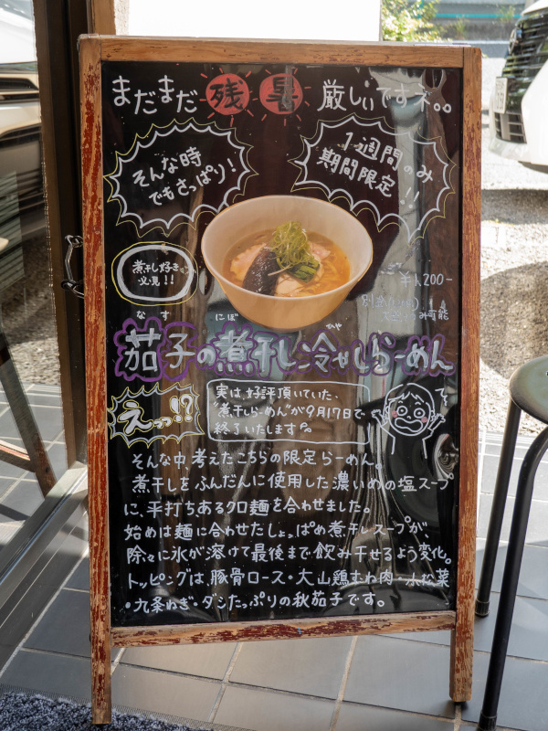 本日より、晩夏の限定「茄子の冷やし煮干しらーめん」¥1200
