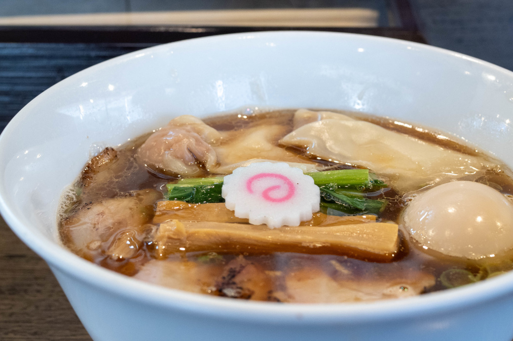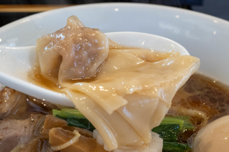 豚バラ … 炭火でじっくりつるし焼きにし、脂を適度に落として旨味をとじ込めています。 《ワンタン》 国産豚ひき肉に生姜をしっかりきかせ、自家製の皮で包み込んでいます。