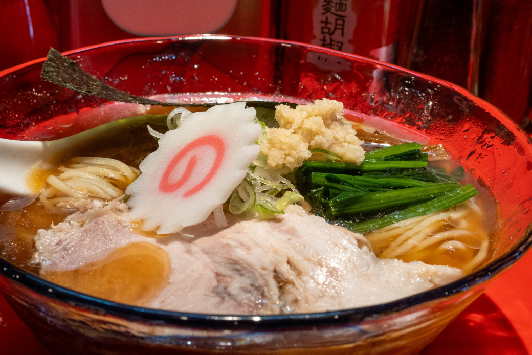(限定) 冷やし生姜醤油ラーメン [2024/7/13] ¥900 7月の限定メニュー 器・レンゲ共々良く冷えていて。ガラスの器が涼しげ。 スープはサラリとして、爽やかに生姜が効いた、甘味のある醤油味。 表面には透明な脂が浮いているが、しつこさはない。 麺は中細ストレートで、国産小麦100%? 氷水で締めてあり、表面がツルツルで、弾力のある強めの食感。 小麦の香りと甘みがあり、麺そのものが美味しい。 (自家製麺) チャーシューは肩ロースが2枚で、薄味の味付けで肉の旨味があり美味しい。 メンマはコリコリとした食感で風味が良い。 その他の具は、青菜、ナルト、海苔。 薬味は、長ネギの白い部分の小口切り。 良く冷えた爽やかなスープの夏らしい一杯! |
