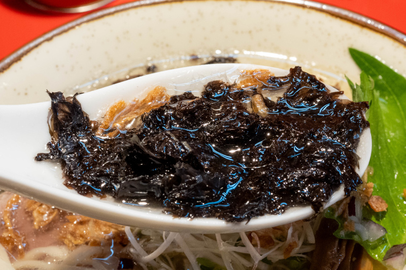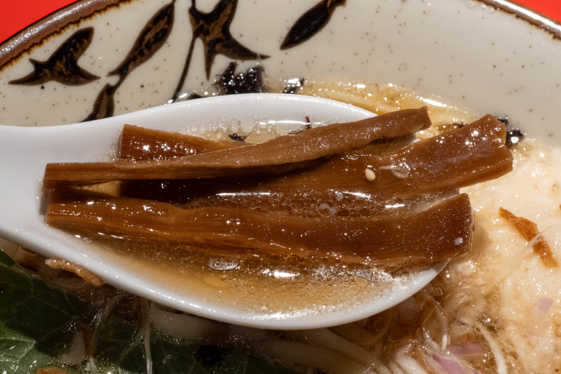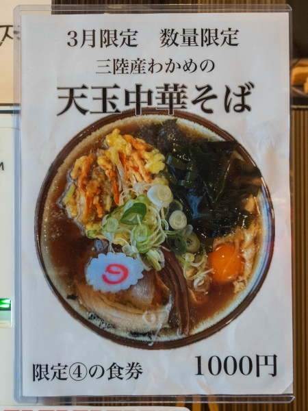 (限定) 三陸産生わかめの天玉中華そば [2025/3/9] ¥1000 2025/3の限定メニュー スープはダシ感のある醤油スープで、生姜は入っていない。 動物系+乾物系の清湯スープのようだ。 表面の油は少なく、スッキリとした味わい。 醤油のクッキリとした味わいで、味付けはやや濃いめ。 三陸産生わかめの磯感が味変アイテム。 麺は太めの平打ち縮れで、国産小麦100%? 適度な硬さの茹で上げで、スープとの絡みが抜群に良い。 表面がツルツルで、しなやかでモチッとした食感。 小麦の香りと甘みがあり、麺そのものが美味しい。 (自家製麺) チャーシューは肩ロースで、ホロッと柔らかい。薄味の味付けで肉の旨味があり美味しい。 三陸産生わかめは肉厚でコリコリとした食感で、磯感がある。 かき揚げは海老・野菜入り。衣が多めで、スープを吸うとさらに美味しくなる。 玉子は落とし卵で、白身は固まっているが黄身はほぼ熱が入っていない。 メンマは濃い色で、コリコリとした食感で風味が良い。 その他の具は、ナルト。 薬味は、長ネギの小口切り。 ノスタルジックな味わいの一杯 |