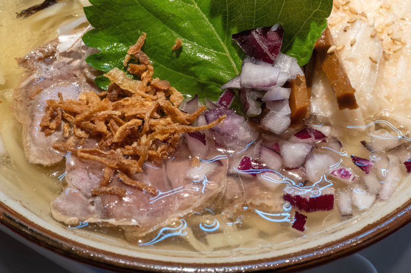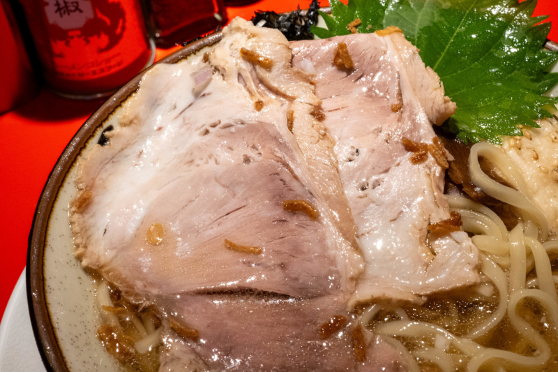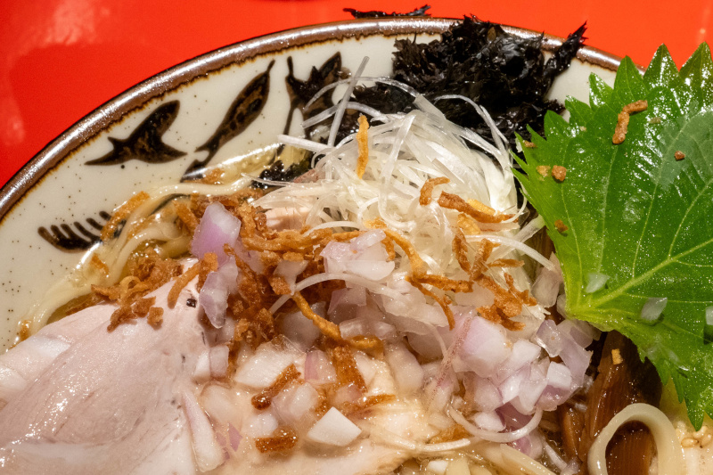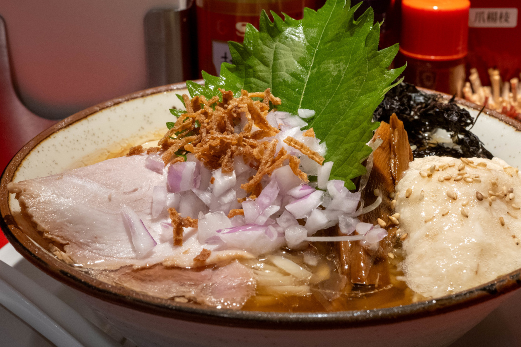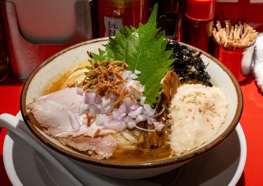(限定) 青唐塩ラーメン+固茹で煮卵 [2025/2/4] ¥900+¥100 羽村激辛フェス2025参加の限定メニュー スープ・麺などはレギュラーの塩ラーメンを踏襲。生姜はなしで、青唐の辛さをプラスしたもののようだ。 透明感のある塩スープは、オーダーの都度小鍋で温めているので熱々。 鶏・豚などの動物系が主体の清湯スープのようだ。 表面の油は多めだがくどくなく、スッキリとした味わい。 塩のスッキリした味わいで、味付けは濃すぎない。 青唐辛子の辛さは、最初はじんわりと、食べ進むにつれて徐々に辛さが染み渡る旨辛スープ。 バラ海苔の磯感。紅生姜の爽やかさが味変アイテム。 麺は太めの平打ちストレートで、国産小麦100%? やや柔らかめの茹で上げで、スープとの絡みが抜群に良い。 表面がツルツルで、しなやかで弾力のある食感。 小麦の香りと甘みがあり、麺そのものが美味しい。 (自家製麺) チャーシューは肩ロースが2枚で、ホロッと柔らかい。薄味の味付けで肉の旨味があり美味しい。 固茹で煮卵は半分にカットしてある。 黄身は固茹でで、白身は表面に近い部分が濃いめに色づいている。半熟味玉とは全く異なる美味しさ。 メンマは濃い色で、コリコリとした食感で風味が良い。 その他の具は、ナルト。 薬味は、長ネギの小口切り、青唐辛子、バラ海苔、紅生姜。 爽やかな辛さのスッキリ塩ラーメン |