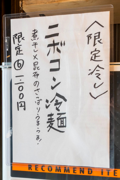 (限定) ニボコン冷麺(塩) [2025/8/12] ¥1100 2025/8/8からの限定メニュー POPより 煮干し×昆布のさっぱりうまらあ! (同じ印象はコピペ) 器もレンゲも冷蔵庫で冷やしてあり、氷は入っていないが、後半まで冷たさが持続する。 煮干し・昆布の旨味がたっぷりのスープ。 塩ベースで、クッキリとした味付け。 表面には透明な脂が浮いているが、しつこさはない。 バラ海苔の磯感と揚げネギの香ばしさが味変アイテム。 大葉のサッパリ感もイイ。 麺は平打ちストレートで、国産小麦100%? 水で〆てあるので、表面はツルツルと滑らかで、強めの弾力がある。 小麦の香りと甘みがあり、麺そのものが美味しい。 (自家製麺) チャーシューは大きい薄めのカットの肩ロースが2枚で柔らかい。薄味の味付けで肉の旨味があり美味しい。 メンマは濃い色で、コリコリとした食感で風味が良い。 トロロが冷製スープに良く合う。 薬味は、白髪ネギ、刻み玉ねぎ、茗荷、大葉、白ゴマ。 暑い日にピッタリの一杯! |