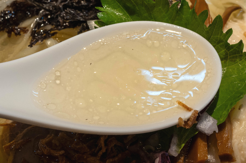 (限定) 昆布水つけ麺・塩+固茹で煮卵 [2025/4/3] ¥800+¥100+(席を移動した)サービス 2025/4/3 限定メニュー 昆布水(つけ麺のみ) 100円 限定の昆布水を提供するので、麺の容器が皿ではなく丼になる。 麺、スープとも塩ラーメンを踏襲した味わいだが、平打ち麺になってからは初。 麺量は並で225gとたっぷり。 麺は平打ちストレート太麺は、国産小麦100%? 冷水で〆てあり適度な硬さで、表面はツルツルと滑らか。 モチッとした歯切れ感と、小麦の香り・甘味があり、 そのままでも昆布水の旨味がプラスされて、麺そのものが美味しさが良くわかる。 刻み海苔がトッピングしてあり、ほんのりとした磯感がある。 (自家製麺) つけ汁は熱々で、鶏・豚などの動物系が主体の清湯塩スープ。 味付けはまろやかさだけでなくシャープさも持ち合わせた塩味で、つけ汁らしい濃さ。 表面の油は多めだがくどくなく、生姜が香るスッキリとした味わい。 固茹で煮卵は麺にトッピング。 半分にカットしてあり、黄身は固茹でで、白身は表面に近い部分が濃いめに色づいている。半熟味玉とは全く異なる懐かしい美味しさ。 煮卵以外の具は、つけ汁の中に入っている。 チャーシューは肩ロースの煮豚で、ホロッと柔らかく肉の旨味がある。 メンマは平たく黒っぽく、コリコリとした食感で風味が良い。 その他の具は、ナルト。 薬味は長ネギの小口切りが多め。 スープ割りは、丼に残った昆布水で。 通常のスープ割りとは異なり、さらに温度が低くなるが、今まで感じなかった味わいが出てくるのは目から鱗。 シャキッとした塩のつけ汁に、スルスルとした啜り心地の麺が抜群に美味しい! |