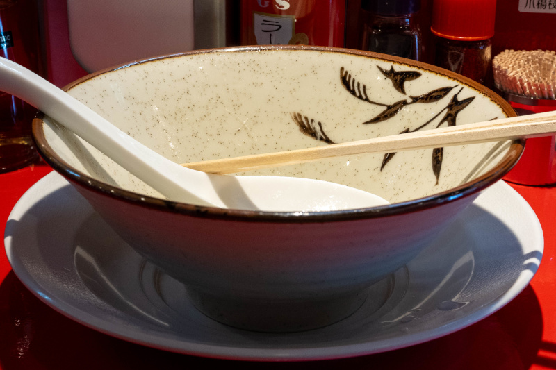 (限定) 冷やし辛味噌ネギラーメン・手揉み太麺 [2025/6/20] ¥1000+¥50 2025/6/20の限定メニュー 冷製スープはダシ感のあるスッキリとした味噌味で、芳醇な香ばしさがあり、味わいは穏やか。 表面には多めのラー油が浮き、徐々に辛さが効いてきて、後半はかなり辛さを感じる。 氷は入っていないが、丼だけでなくレンゲもキンキンに冷えているので、後半まで冷たさが持続する。 麺は直前に手揉みを加えてある。 太めの平打ち縮れで、国産小麦100%? 水で〆てあるので、表面はツルツルと滑らかで、強めの弾力がある。 小麦の香りと甘みがあり、麺そのものが美味しい。 (自家製麺) チャーシューは大きい薄めのカットの肩ロースで柔らかい。薄味の味付けで肉の旨味があり美味しい。 ネギはラーショに酷似したカットで、ネギの辛さとシャキっと感がある。 茹でモヤシはシャキシャキ感がある。 メンマは濃い色で、コリコリとした食感で風味が良い。 その他の具は、海苔。 薬味は、ラー油、青ネギの小口切りが少量。 暑い日にピッタリの一杯! |