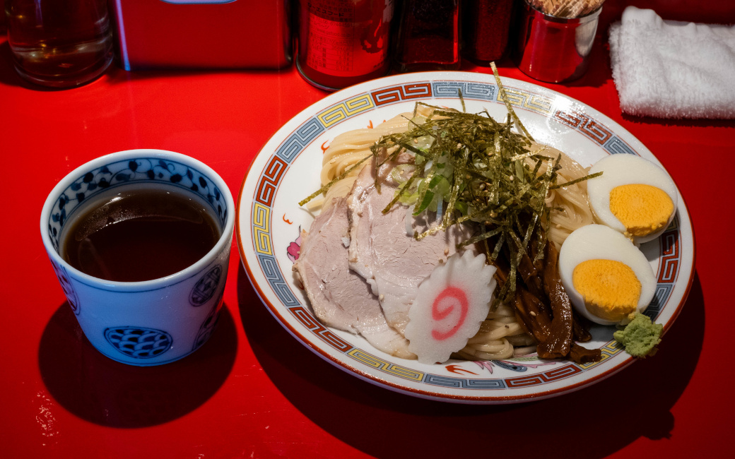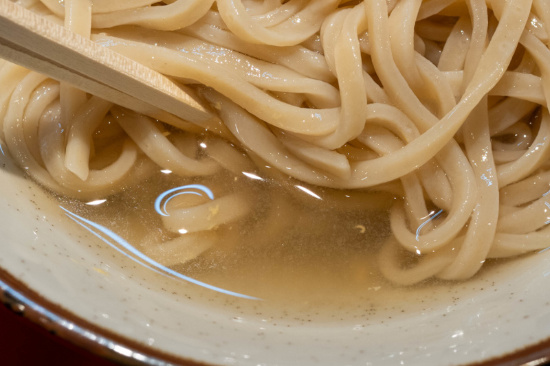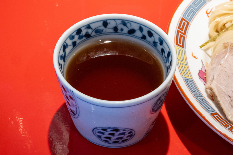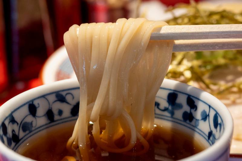 (限定) 稲庭中華そばの淡口ざる中華 [2025/9/7] ¥1000 2025/9/7の限定メニュー POPより 本日数量限定 『稲庭中華そばの淡口ざる中華』 売り切れ次第終了 自家製麺ではなく、市販の乾麺「稲庭中華そば」を使用。 平打ちストレート麺は冷水で〆てあり適度な硬さで、表面はツルツルと滑らか。 強めの歯切れ感と、小麦の香り・甘味があり、麺そのものが美味しさが良くわかる。 さわびが爽やかさな辛さがとても合う。 (乾麺「稲庭中華そば」) つけ汁は冷製で、クリア感のある和風ダシのつけ汁。 味付けはまろやかさのある醤油味で、つけ汁にしてはやや薄め。 表面の油は未使用。 具は麺にトッピングされている。 チャーシューは脂が少なめの肩ロースで柔らかい。薄味の味付けで肉の旨味があり美味しい。 茹で玉子は、固茹で。 メンマは濃い色で、コリコリとした食感で風味が良い。 その他の具は、刻み海苔、ナルト。 薬味は、長ネギの小口切り、わさび。 スープ割りはない。 シンプルなつけ汁で、稲庭中華の良さを堪能できる。 |