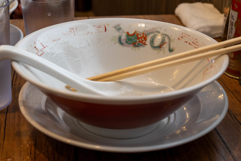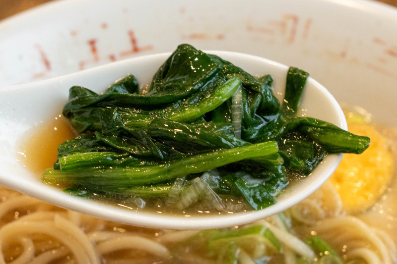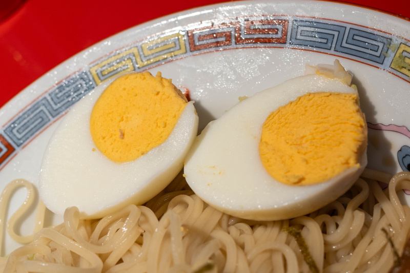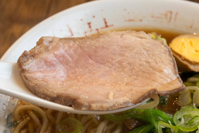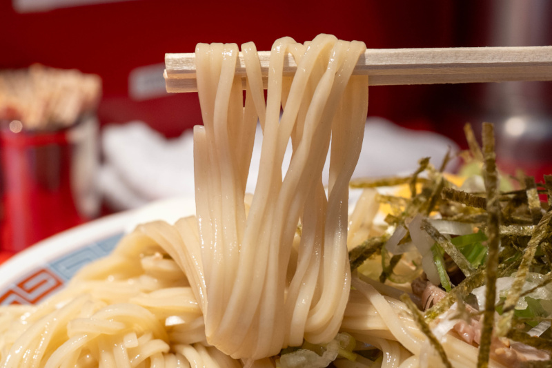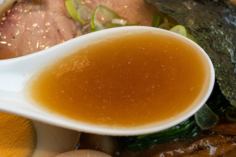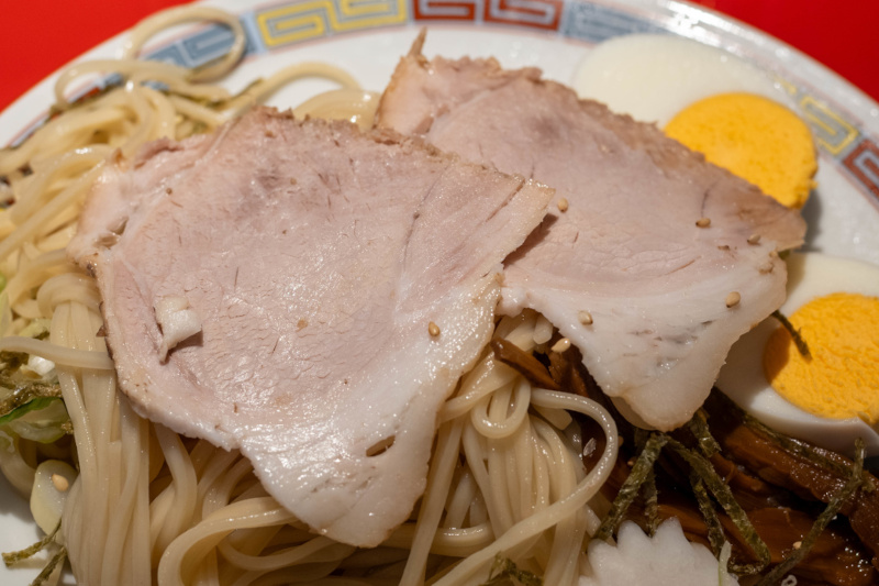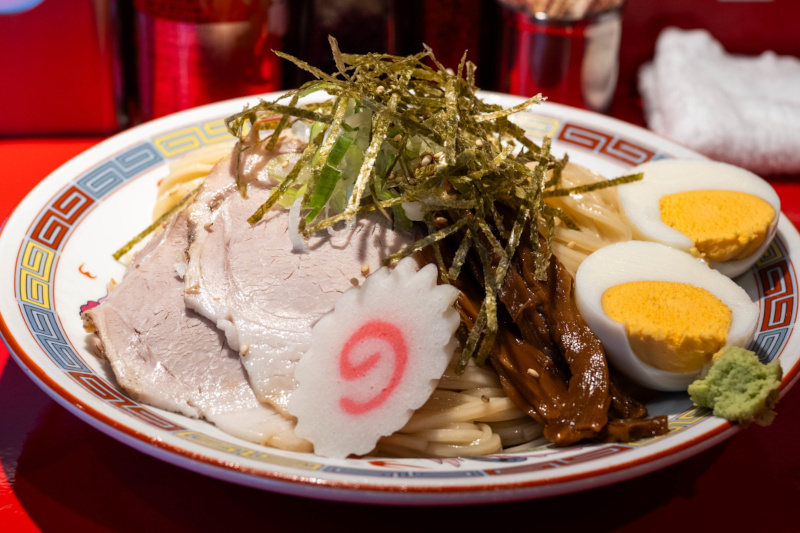 (限定) 藤枝風冷やしラーメン + 煮卵 [2025/9/3] ¥900+¥100 2025/9/3からのきまぐれ限定メニュー XやPOPにラーメンの説明はないが、マルナカ@藤枝の「冷やし」の印象は ▶ 冷製スープは甘口の醤油味で鰹節がメインの和風スープ。油は無し ▶ 平打ち麺 ▶ トッピングは、モモ肉チャーシュー、メンマ、海苔、わさび、紅生姜、ねぎ 器もレンゲも冷蔵庫で冷やしてあり、氷は入っていないが、後半まで冷たさが持続する。 鰹節・昆布の旨味が染み出たスープは、甘味のある醤油味。 表面の脂はなしで、スッキリとした味わい。 海苔の磯感と、わさび、紅生姜のサッパリ感が味変アイテム。 麺は平打ちストレートで、国産小麦100%? 水で〆てあるので、表面はツルツルと滑らかで、強めの弾力がある。 小麦の香りと甘みがあり、麺そのものが美味しい。 (自家製麺) チャーシューは脂が少ないモモ肉が3枚で柔らかい。薄味の味付けで肉の旨味があり美味しい。 煮卵は半分にカットしてあり、黄身は固茹でで、白身は表面に近い部分が濃いめに色づいている。半熟味玉とは異なる懐かしい味わい。 メンマは濃い色で、コリコリとした食感で風味が良い。 その他の具は、海苔。 薬味は、長ネギの小口切り。 藤枝の冷やしの特徴をよく捉えた、暑い日にピッタリの一杯! |