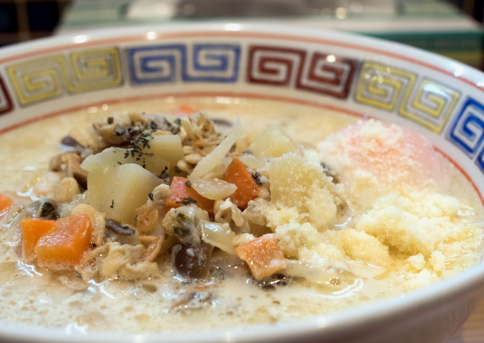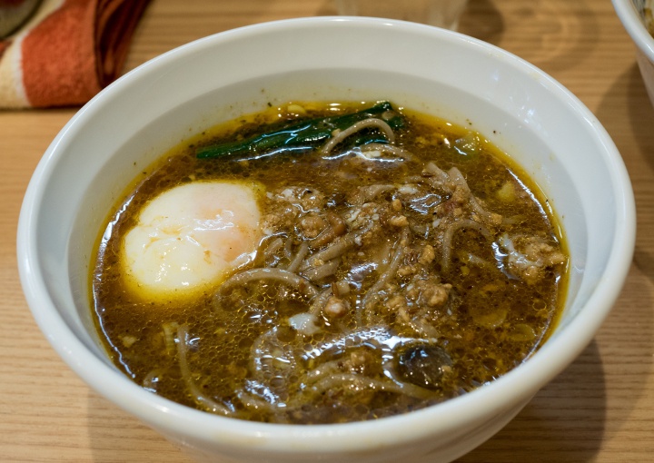 やや濁りのあるスープは、鶏・豚を少し乳化させたもので、味付けはたまり醤油と再仕込み醤油。 |