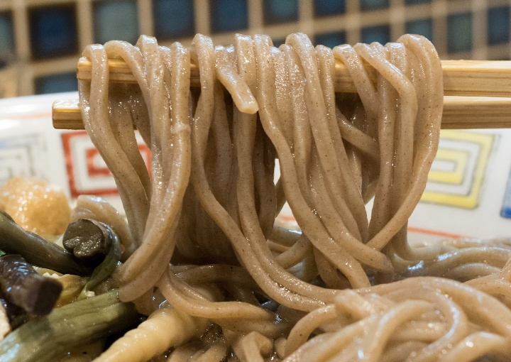 麺は蕎麦というよりも、ラーメン用の麺に蕎麦粉を混ぜたというのが正しいかもしれない。 |