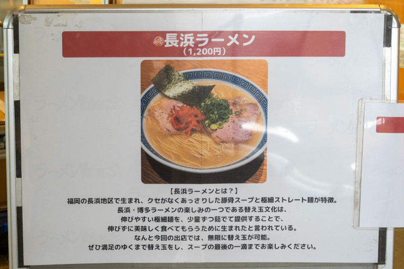 【博多ラーメン でぶちゃん】 長浜ラーメンの真髄! 2026/1/21・22の出店 [2026/1/21] 長浜ラーメン 1200 [2026/1/21]・茹で卵入り 1300・ネギ増し 1400・肉増し 1600 替え玉 無料 明太子ごはん 500 店主との記念写真券 無料 ラーメンWalker2026 カレンダー 2000 アサヒ生 ジョッキ缶 450、レモンサワー・ハイボール 400 紹興酒 700、グラスワイン 赤/白 500 (ノンアルコールビール)アサヒドライゼロ 300 コカコーラ・オレンジジュース 200、黒烏龍茶 300