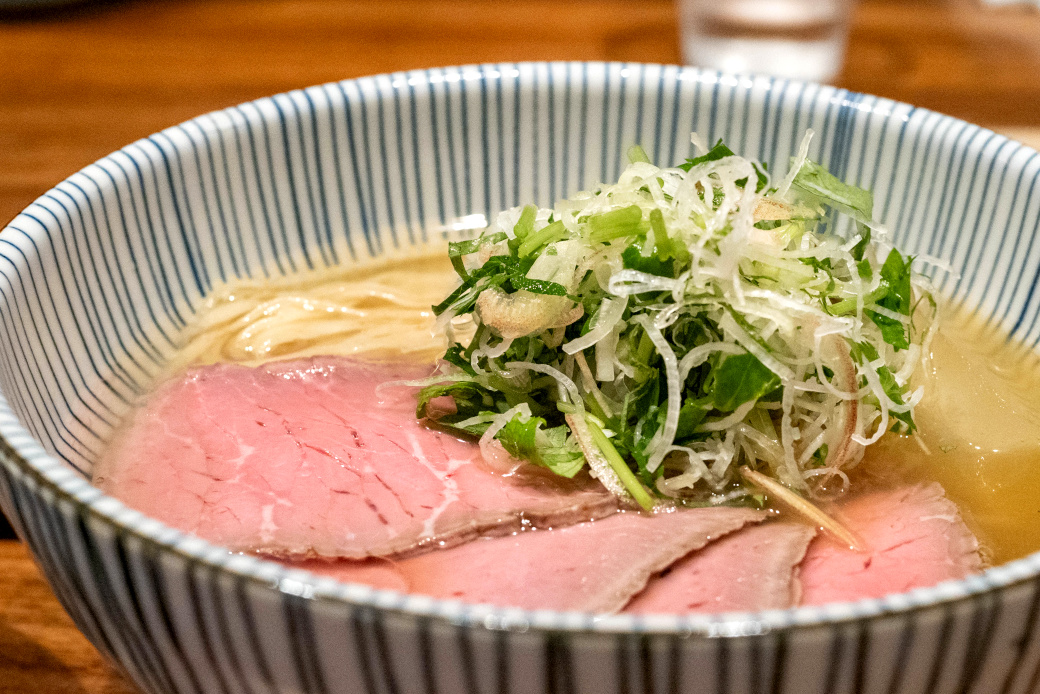 1日10食限定 1300円 『鈴ノ木専用粉』と『春よ恋全粒粉』をブレンドした平打ち麺を冷水でしめ、伊吹いりこ、鰺煮干し、うるめ、北海道産真昆布でとった冷たい煮干しスープを合わせた、暑い日に食べたい清涼感たっぷりの冷やしラーメンです 今年はローストビーフと薬味(みょうが・大葉・三つ葉・白髪ねぎ)を乗せてご提供します ※出汁氷を使用しているのでスープは薄まることなく最後まで冷たく召し上がれます 〆茶漬けセットがおすすめです。 麺量は150g、200gからお選びください ・肉増し 【内容】 ローストビーフ増量 500円 ・〆茶漬けセット 300円 【内容】 ごはん・日替わりお漬物・五色あられ・海苔・山葵 透明感のある醤油スープは、キンキンに冷えている。 伊吹いりこ、鰺煮干しのクッキリとした旨味と香りがある。 味付けは醤油ベースで甘みがあり、塩分が強すぎずにまろやか。 魚系ダシと醤油の相性が非常に良く、塩とは違う美味しさがある。個人的には醤油も好み。 表面には少量の油が浮いて、適度なアクセントになっている。 ダシ氷も煮干しがしっかりで、食べ終わるまで冷えたままで、スープが薄まることがない。 麺は平打ちストレート。テポで茹でた後に冷水でしっかりと冷やしてある。 滑らかでツルッとした口当たりと、押し返すような強さとしなやかさがあり、さらに美味しくなった印象。 小麦の香りと甘みがあり、麺そのものが美味しい。 (自家製麺) チャーシューはローストビーフが4枚。(昨年はチャーシュー3種) 低温ローストで、肉の旨味がある。 薬味は、みょうが、大葉、三つ葉、白髪ネギ。 茗荷と大葉の味わいが涼しげで、冷たいスープに良く合っている。 〆茶漬けセットは、ご飯に五色あられ・海苔・山葵をトッピングして、冷たいスープを注いでお茶漬けに。 温かいご飯に合わせると、スープは違った表情を見せる。 ご飯との相性は抜群に良い。 暑い夏にピッタリの一杯! |
