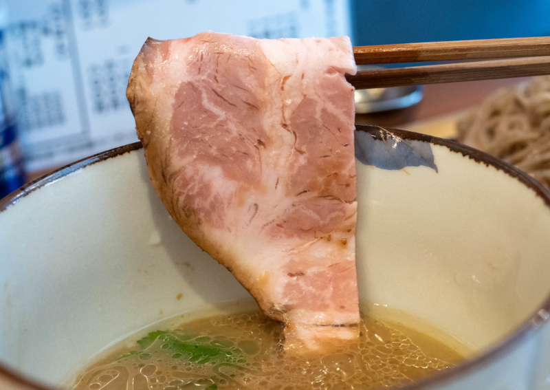 透明感のある醤油スープは、キンキンに冷えている。 伊吹いりこ、鰺煮干しのクッキリとした旨味と香りがある。 味付けは塩ベースで甘みがあり、塩分が強すぎずにまろやか。 醤油よりもダシ感をダイレクトに感じ、醤油とは違う美味しさがある。個人的には塩も好み。 表面には多めの油が浮いて、適度なアクセントになっている。 ダシ氷も煮干しがしっかりで、食べ終わるまで冷えたままで、スープが薄まることがない。 麺は平打ちストレート。テポで茹でた後に冷水でしっかりと冷やしてある。 滑らかでツルッとした口当たりと、押し返すような強さとしなやかさがあり、さらに美味しくなった印象。 小麦の香りと甘みがあり、麺そのものが美味しい。 (自家製麺) チャーシューは大きいローストビーフが2枚。(前回のローストビーフは特大1枚) 低温ローストで、牛肉の旨味がある。 薬味は、みょうが、大葉、三つ葉、白髪ネギ。 茗荷と大葉の味わいが涼しげで、冷たいスープに良く合っている。 〆茶漬けセットは、ご飯に五色あられ・海苔・山葵をトッピングして、冷たいスープを注いでお茶漬けに。 温かいご飯に合わせると、スープは違った表情を見せる。 ご飯との相性は抜群に良い。 暑い夏にピッタリの一杯! |