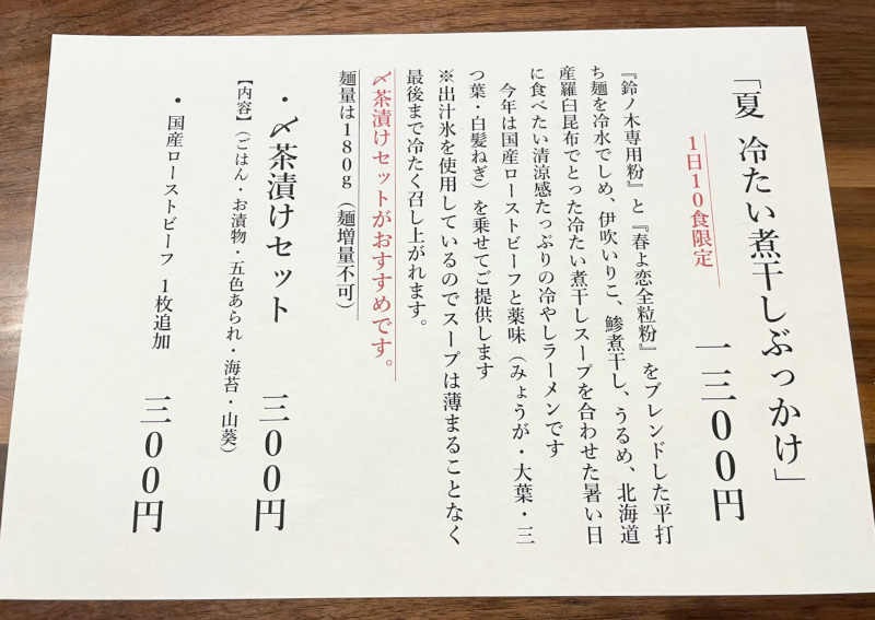 冷たい煮干しぶっかけ・醤油+〆茶漬けセット [2025/9/1] ¥1300+¥300 2025/6/6から提供の夏の限定メニュー (1日10食限定) POPより
