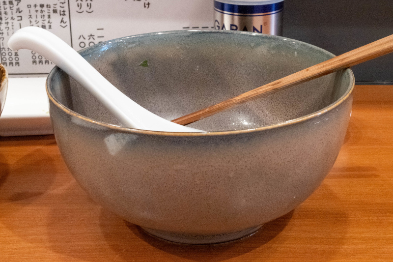 透明感のある醤油スープは、キンキンに冷えている。 伊吹いりこ、鰺煮干しのクッキリとした旨味と香りがある。 味付けは醤油ベースで甘みがあり、塩分が強すぎずにまろやか。 魚系ダシと醤油の相性が非常に良く、塩とは違う美味しさがある。個人的には醤油も好み。 表面には多めの油が浮いて、適度なアクセントになっている。 ダシ氷も煮干しがしっかりで、食べ終わるまで冷えたままで、スープが薄まることがない。 麺は平打ちストレート。テポで茹でた後に冷水でしっかりと冷やしてある。 滑らかでツルッとした口当たりと、押し返すような強さとしなやかさがあり、さらに美味しくなった印象。 小麦の香りと甘みがあり、麺そのものが美味しい。 (自家製麺) チャーシューは特大のローストビーフが1枚。(昨年のローストビーフは小4枚) 低温ローストで、牛肉の旨味がある。 薬味は、みょうが、大葉、三つ葉、白髪ネギ。 茗荷と大葉の味わいが涼しげで、冷たいスープに良く合っている。 〆茶漬けセットは、ご飯に五色あられ・海苔・山葵をトッピングして、冷たいスープを注いでお茶漬けに。 温かいご飯に合わせると、スープは違った表情を見せる。 ご飯との相性は抜群に良い。 暑い夏にピッタリの一杯! 器が変わって昨年と趣が異なるのも良い |