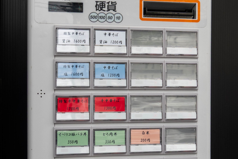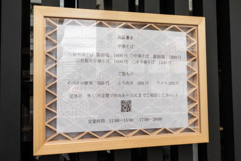 [2025/10/6] ※ 特製は ワンタン2個、別皿トッピング(顔・鶏・豚チャーシュー、厚焼き玉子、メンマ) が追加 中華そば 醤油/塩 1200 塩[2025/10/7] 特製中華そば 醤油/塩 1600 醤油[2025/10/6] (提供予定) 辛中華そば 1200、特製辛中華そば 1600 イベリコ豚丼 350 (提供予定) とろ肉丼 350 ライス 200 |
