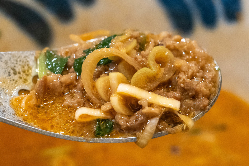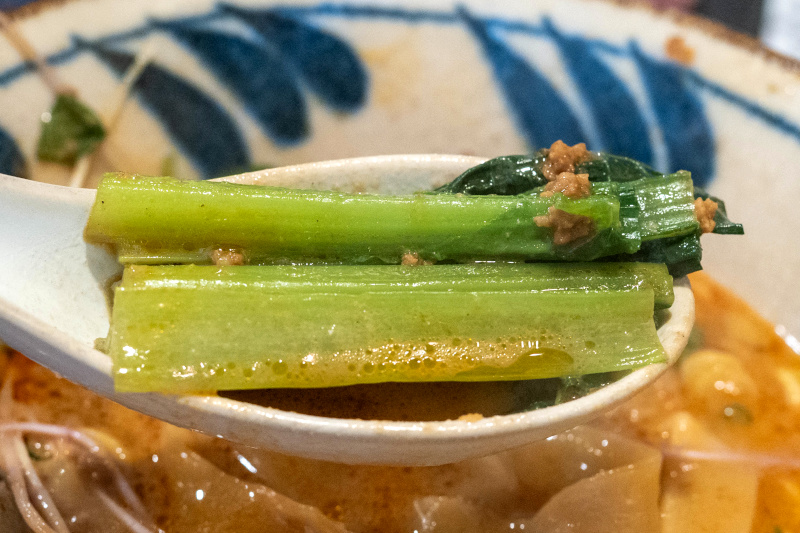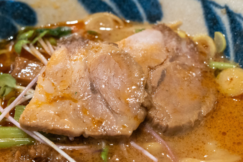 担々麺 [2025/6/3] ¥1600 *** 担々麺 *** オーダー時に辛さを指定する。「普通でも辛い」とのこと。 芝麻醤やラー油は自家製のようだ。 胡麻・ナッツのフレッシュさのある香りとまろやかさに、適度な辛さのラー油が効いて本格的な味わい。 味付けは濃すぎずにちょうど良い。 麺は以前の醤油と同じ。 超幅広の3層構造で、セモリナ粉の生地を、もち姫・さぬきの夢の生地でサンドしてある。 表面はもちもち、中はアルデンテのようなコシのある仕上がりになっている。 とろみのあるスープが麺に良く絡む。 (自家製麺) チャーシューは肩ロースで、柔らかく肉の旨味がある。 挽肉を食べるのに便利な穴あきレンゲが重宝する。肉の美味しさがある。 メンマは太く濃い色、サクッとした歯切れ感があり風味が良い。 小松菜はシャキシャキと瑞々しい。 薬味は、紫キャベツのスプラウト、長ネギの小口切り、三つ葉。 *** 別皿トッピング *** チャーシューなどは別皿。 添えてある薬味は、マスタード、わさび、塩、醤油ベースのたれ。 ハンガリー産マグレカナール鴨肉 : しっかりとした歯応えで、噛みしめるたびに旨味が染み出してくる印象。 桜姫鶏のむね肉 : しっとりとした柔らかさと、銘柄鶏らしい旨さ。 ガリシア栗豚肩ロース : ローストポークで脂身が少なく、赤身の旨さが特筆。 濃紅卵の卵黄 : 濃厚な黄身の旨さ、鴨肉や麺を漬けても美味しい。 担々麺の満足度はもちろん、別皿の鴨などの旨さが加わり、極めて満足度が高い! 《使用食材》 (前回同様)