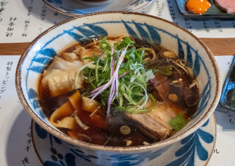 特製中華そば 醤油 [2025/4/22] ¥1800 *** 中華そば *** 動物系は鴨と軍鶏で、表面の油は鴨。そこに煮干しなどの和風乾物系が加わる。 表面の鴨油が甘く香ばしい風味と、適度なコッテリ感を醸し出している。 鴨がグッと主張して、香ばしく甘味のある奥深い味わい。 味付けは見た目ほど濃くなく、まろやかで芳醇な醤油味。 麺は超幅広の3層構造で、セモリナ粉の生地を、もち姫・さぬきの夢の生地でサンドしてある。 表面はもちもち、中はアルデンテのようなコシのある仕上がりになっている。 スープとの相性が抜群に良い。 (自家製麺) チャーシューは、四元豚バラの煮豚が2枚で。柔らかく脂の甘みと肉の旨さがある。 ワンタンは肉ワンタン2個で、肉の旨味が詰まっており、皮はトロッとして美味しい。 メンマは太く濃い色、サクッとした歯切れ感があり風味が良い。 小松菜はシャキシャキと瑞々しい。 薬味は、紫キャベツのスプラウト、長ネギの小口切り、三つ葉。 *** 別皿トッピング *** チャーシューなどは別皿で、特製はそれぞれの肉が増量となる。 添えてある薬味は、マスタード、わさび、塩、醤油ベースのたれ。 ハンガリー産マグレカナール鴨肉 : しっかりとした歯応えで、噛みしめるたびに旨味が染み出してくる印象。 桜姫鶏のむね肉 : しっとりとした柔らかさと、銘柄鶏らしい旨さ。 ガリシア栗豚肩ロース : ローストポークで脂身が少なく、赤身の旨さが特筆。 濃紅卵の卵黄 : 濃厚な黄身の旨さ、鴨肉や麺を漬けても美味しい。 中華そばの満足度はもちろん、別皿の鴨などの旨さが加わり、極めて満足度が高い! 《使用食材》