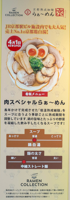[2025/4/7] RAMEN COLLECTION 京都熟成細麺らぁ~めん 京 JR京都駅ビル施設内でも大人気!売り上げNo.1の京都鶏白湯! 《看板メニュー》 肉スペシャルらぁ~めん 長年かけて完成させた「低温熟成細麺」をスープに合うよう季節ごとに熟成期間を調整しています。鶏の旨味とたっぷりの野菜を凝縮した飲み干したくなるラーメンです! スープ 鶏の旨味とたっぷりの野菜を凝縮した飲み干したくなる『鶏白湯スープ』です。