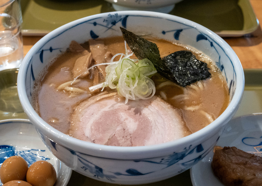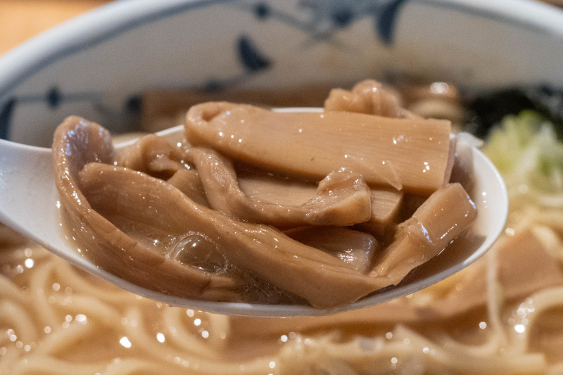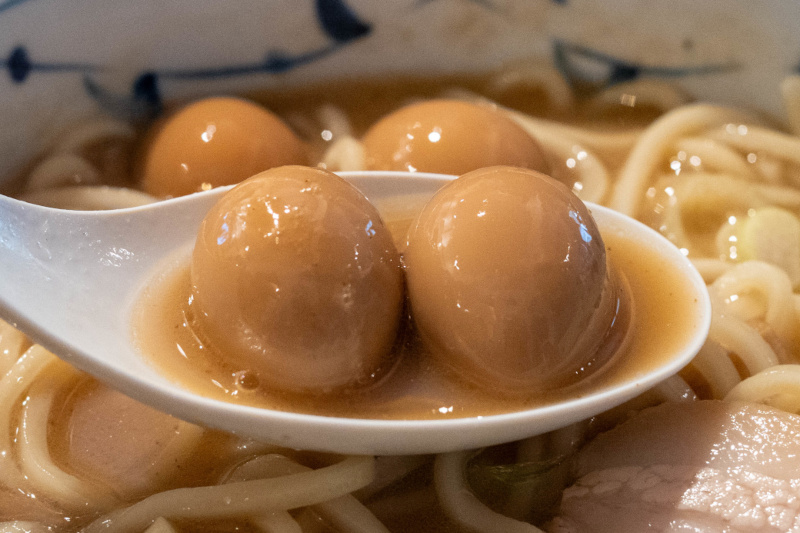 中華そば (+ぽるこ・味玉うずら) [2026/3/27] ¥1100+¥350+¥150 スープは、動物系の厚みに煮干しや鰹節などの和風乾物を合わせた、重層的なWスープ。 表面に薄く膜が張るほどコラーゲンが溶け出しており、素材の濃密な旨味がダイレクトに伝わってくる。 「青葉」に代表される不朽の豚骨魚介スタイルを彷彿とさせるが、無化調で仕上げられたその味わいは驚くほど雑味がない。 醤油の芳醇な風味と甘みが重なり、濃厚さと軽やかな後味を見事に両立させている。 トッピングの海苔がスープに浸ることで広がる香ばしい磯の風味も、このWスープの良きアクセントだ。 麺はニップン北海道産小麦100%に「浅野さん家の卵」を練り込んだ、自家製の中太ストレート。 なめらかな麺肌ともちっとした弾力があり、力強いスープとの馴染みも抜群。 麺量200gというしっかりとしたボリュームが、一杯の満足度を確かなものにしている。 具材も一つひとつに店主の哲学が宿る。 デフォルメのチャーシューは「下田さん家の豚」を使用した厚切りのバラロール。 脂の甘みと肉の旨味が口の中でバランスよく解け、素材の質の高さが際立つ。 熟成タイプのメンマは、コリッとした小気味よい歯切れとともに豊かな風味が鼻を抜け、長ネギの白い部分の小口切りが絶妙な清涼感を添えている。 さらに、主役を引き立てるオプションの存在が、この一杯の充足感をより確かなものにする。 「ぽるか」は、分厚くカットされた豚バラ肉を柔らかく煮込んだ、角煮に近い逸品。圧倒的なボリューム感がありながら、口の中で解れる肉の旨味はスープのコクをより深めてくれる。 また、「味玉うずら」は、褐色に染まった見た目通り味がしっかりと凝縮されており、口の中で弾けるような食感が、重厚な一杯の中で心地よい変化を付けてくれる。 暖簾やトレイ、箸に至るまで緑色系で統一された空間は、日の出町の自然に溶け込むような穏やかな空気感を纏っている。 王道のWスープを無化調・自家製麺で磨き上げ、さらに個性豊かな脇役たちが脇を固める。 素材選びから盛り付けに至るまで一切の妥協がなく、食べるほどに満足感が増していく一杯だ。 |