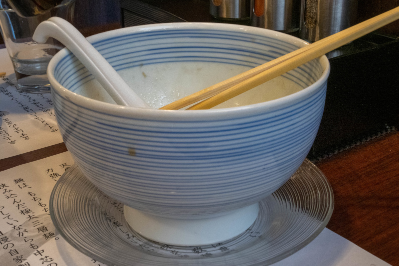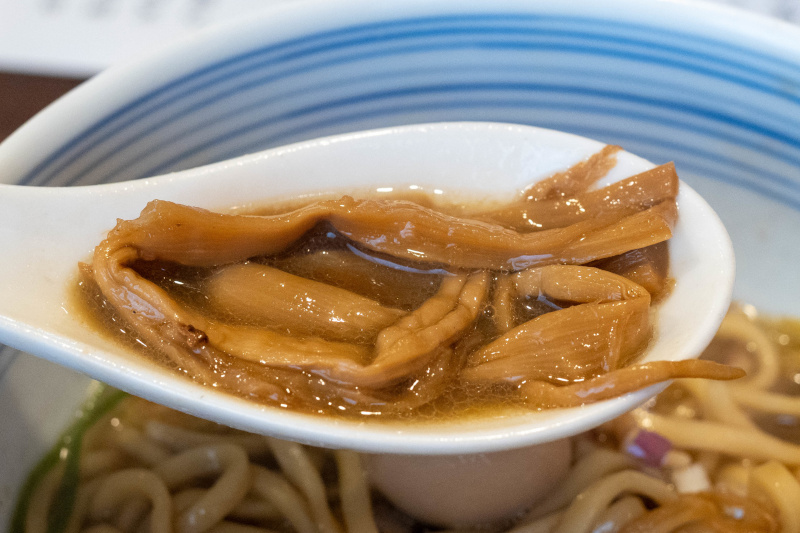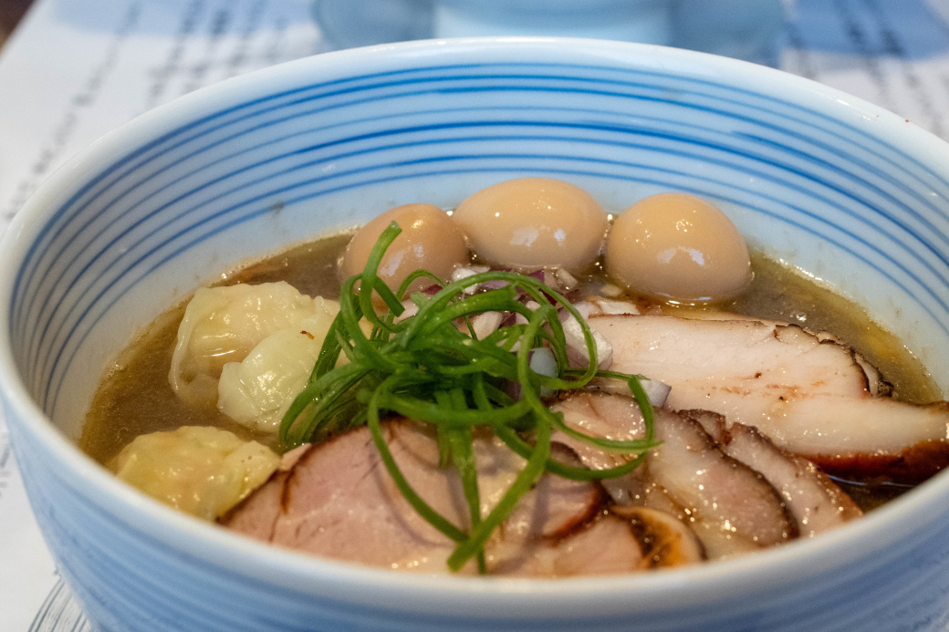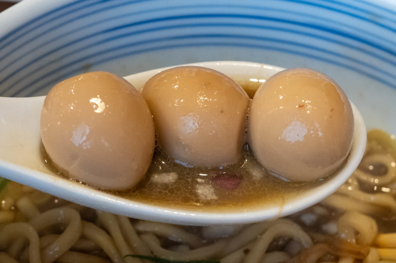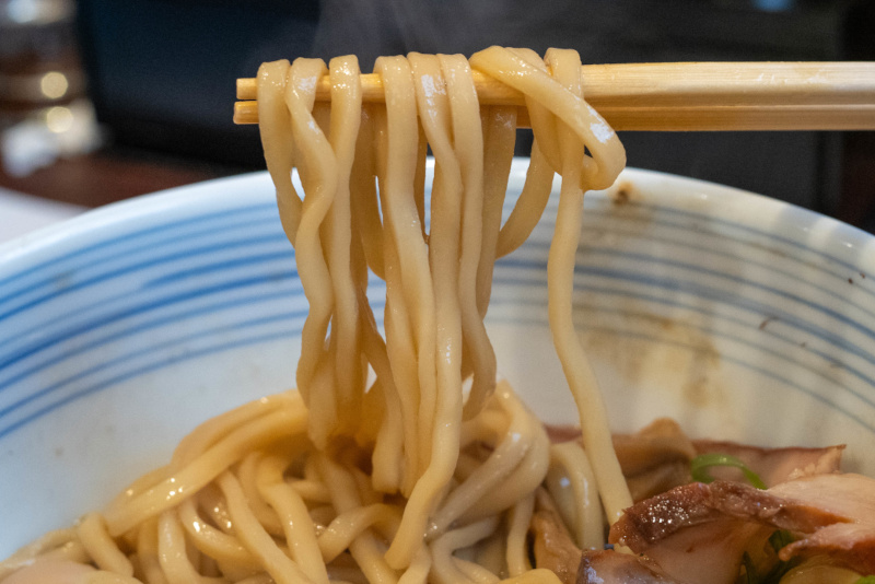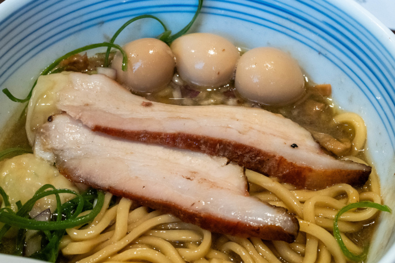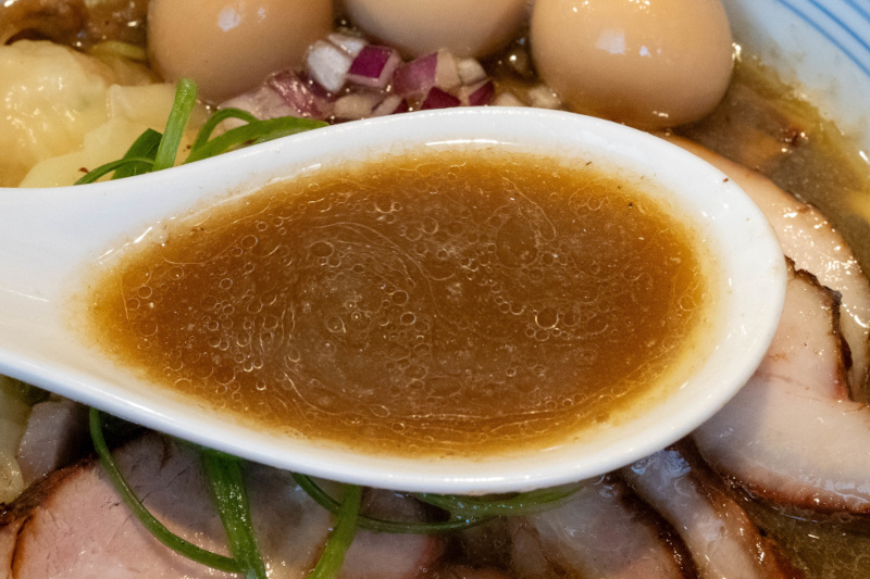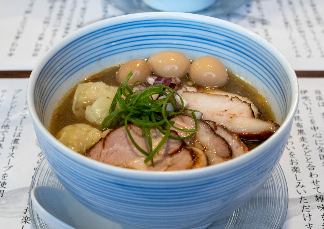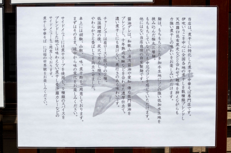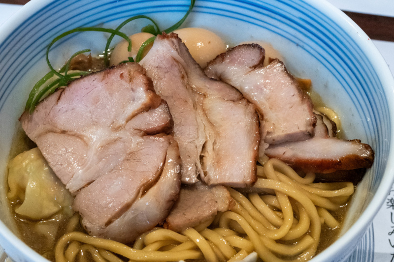 特製 濃厚醤油 [2026/4/20] ¥1000+¥400 (特製:チャーシュー各1枚増、ウズラ煮玉子3個・海老ワンタン2個が追加) ■ スープ:限界まで煮出した「攻め」の煮干しと、羅臼昆布の奥行き 伊吹いりこを中心に数種類の煮干しを、苦みやクセが顔を出すギリギリの境界線まで煮出した濃厚な茶濁スープ。 サラリとした質感ながら、煮干し由来の灰色や緑を帯びた色味に、その抽出の濃密さが表れている。 無化調ゆえの雑味のない後味に、天然羅臼昆布の重厚な旨味と芳醇な醤油の味わいが下支えとなり、濃厚でありながらもしつこさを一切感じさせない。 ■ 麺:スープを真っ向から受け止める、自家製平打ストレート 合わせる自家製平打ストレート麺は、適度な硬さの茹で上げ。 滑らかな麺肌が喉を潤し、モチッとした心地よい食感が弾ける。 噛み締めるほどに広がる小麦の香りと甘みが、限界まで煮出した煮干しの個性に対し、一歩も引かない力強い存在感を放っている。 ■ 具材:手仕事の極致が凝縮された、豪華な競演 圧巻は二種の仕込みで供されるチャーシュー。 肩ロースとバラは、低温調理後に炭火で吊るし焼きにされるという、気の遠くなるような手間が掛けられている。 ジューシーな柔らかさと炭火の香ばしさが同居する逸品だ。 特製で追加されるプリプリの海老ワンタンや、プチッとした弾け感のウズラ煮玉子、香り高い穂先メンマなど、脇を固める具材にも一切の隙がない。 ■ 総評:最適解を求めて辿り着いた、必然の場所 器の中に並ぶすべての要素に、店主の高度な技術と、注ぎ込まれた膨大な労力が垣間見える。 紆余曲折を経て、かつて自らが礎を築いたこの地へと帰還した店主。 最適解を求めて、にぼ福はこの場所に辿り着いたようだ。 その情熱と技術が、煮干しと小麦の力強い調和として結実した、満足極まる一杯だ。 |