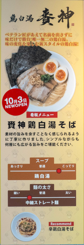 [2025/10/8] 鶏白湯 賚神 ベテラン匠があえて名前を出さずに味だけで勝負! 唯一無二の鶏白湯。 味の変化を楽しむ新スタイルの鶏白湯! 《看板メニュー》 賚神鶏白湯そば 素材の旨味を余すことなく感じられるように丁寧に作りました。シンプルながらも何層にも広がる旨味をご堪能ください。 スープ 鶏白湯