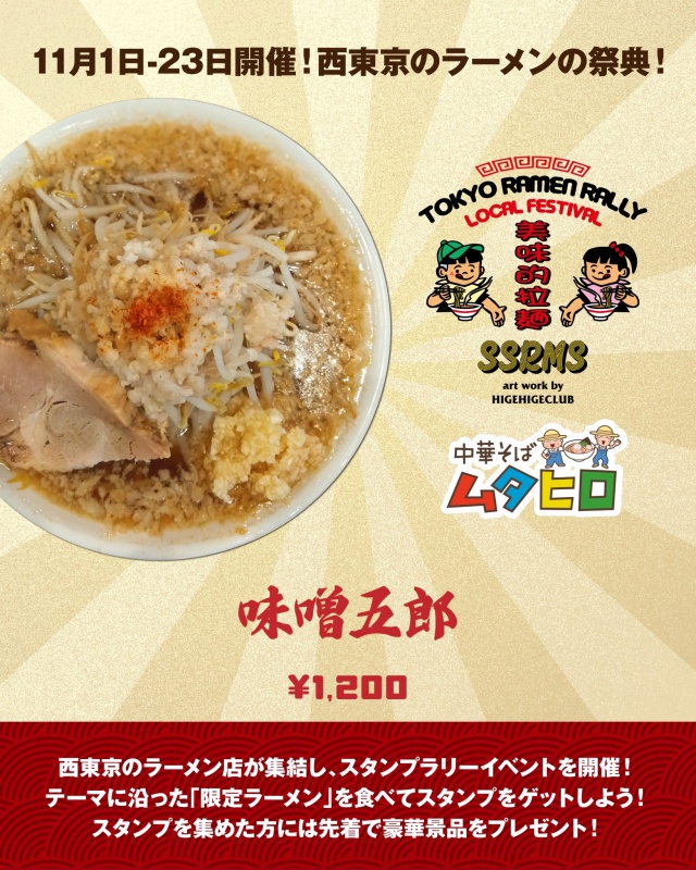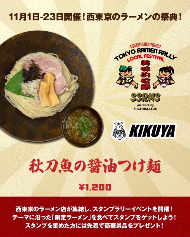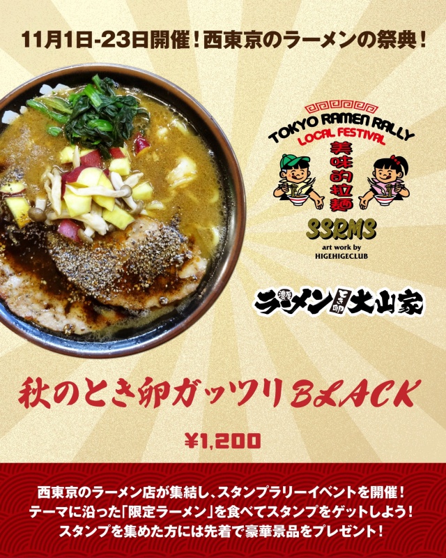 ▶ コンセプト ラーメンを通じて西東京から東京を盛り上げます! ▶ 参加11店舗で限定メニューを食べてスタンプをゲット。 提供メニューのテーマは「秋」 (詳細のルールは [公式X] [公式Instagram] を参照) ▶ 実施期間 : 2025/11/1〜23 ▶ 景品